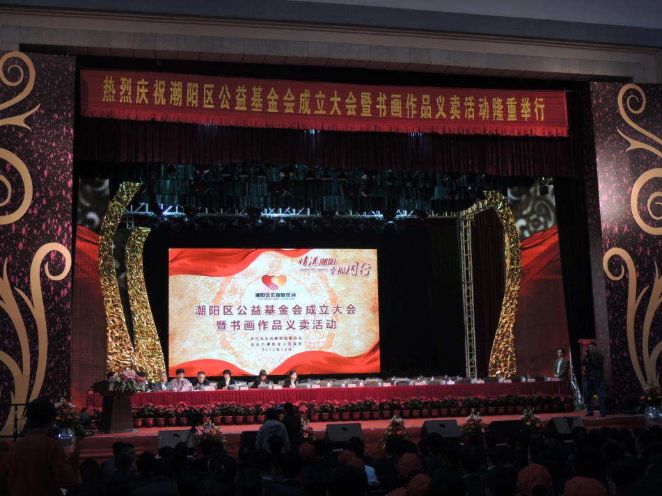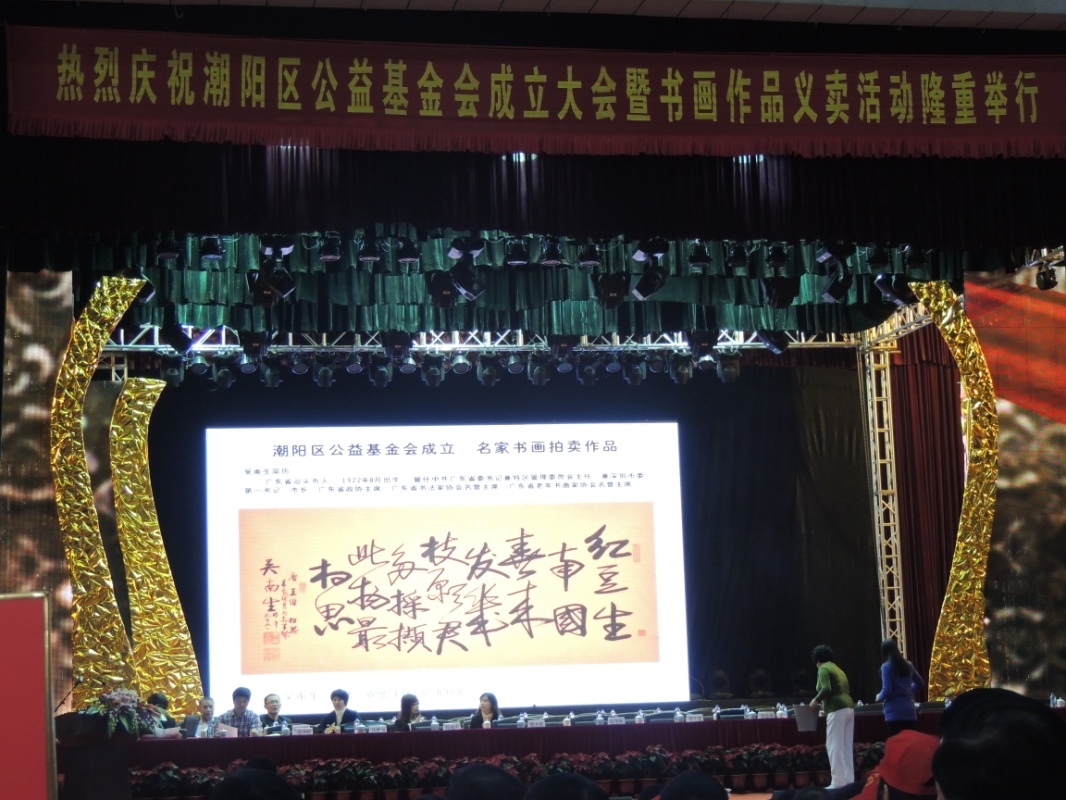 12月12日下午,潮阳区公益基金会名家书画作品义卖活动在影剧院举行,由潮籍省老领导和国内及潮阳本地艺术家捐献的18幅书画作品共拍得善款335万元。
