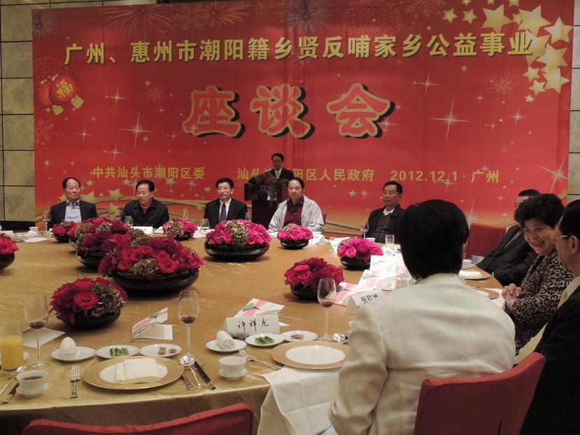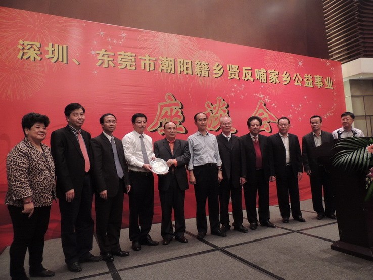 从11月29日到12月1日潮阳区委区政府组织的募捐团队到珠海、深圳、广州开展公益基金募集活动,所到之处都得到各地潮籍老领导和潮商会的鼎力支持, 募捐活动期间,区委书记陈新造等领导还分别拜会珠海潮人海外联谊会、珠海潮人总商会,深圳潮商会和广东潮商会,与广大潮商亲切座谈,共谋家乡发展大计。同时,与各地潮商会互赠纪念品.