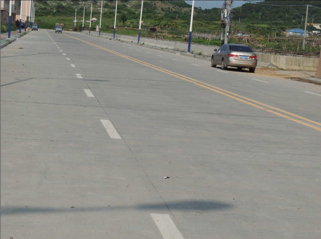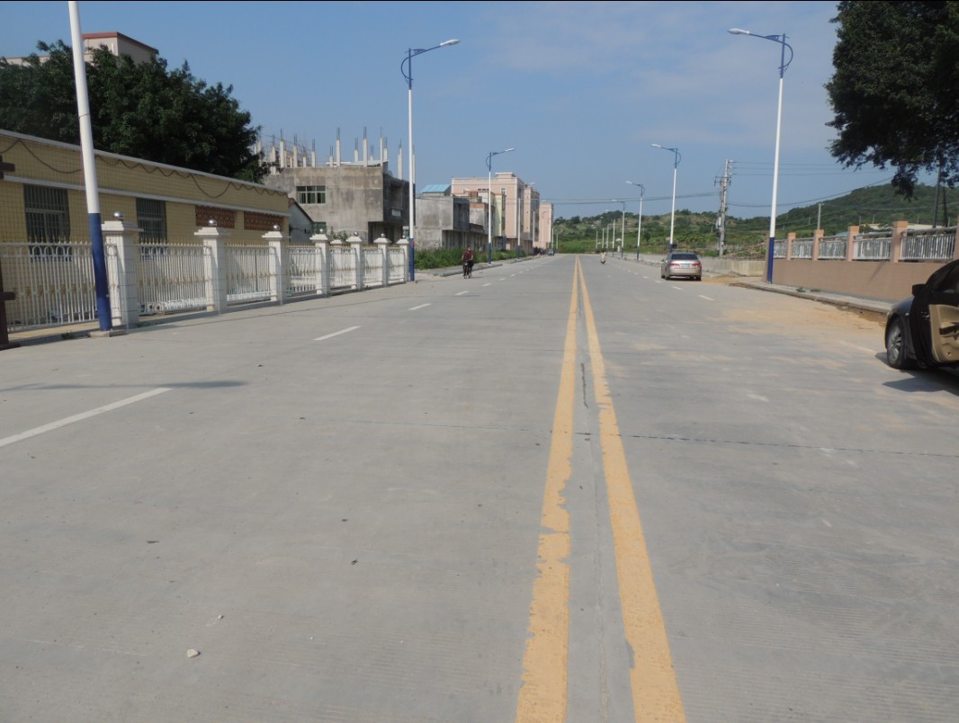 路面厚度22厘米,全长1800米,宽20米,道路两旁建设有步行道,LED节能路灯50多支和16个垃圾废物箱等配套设施。