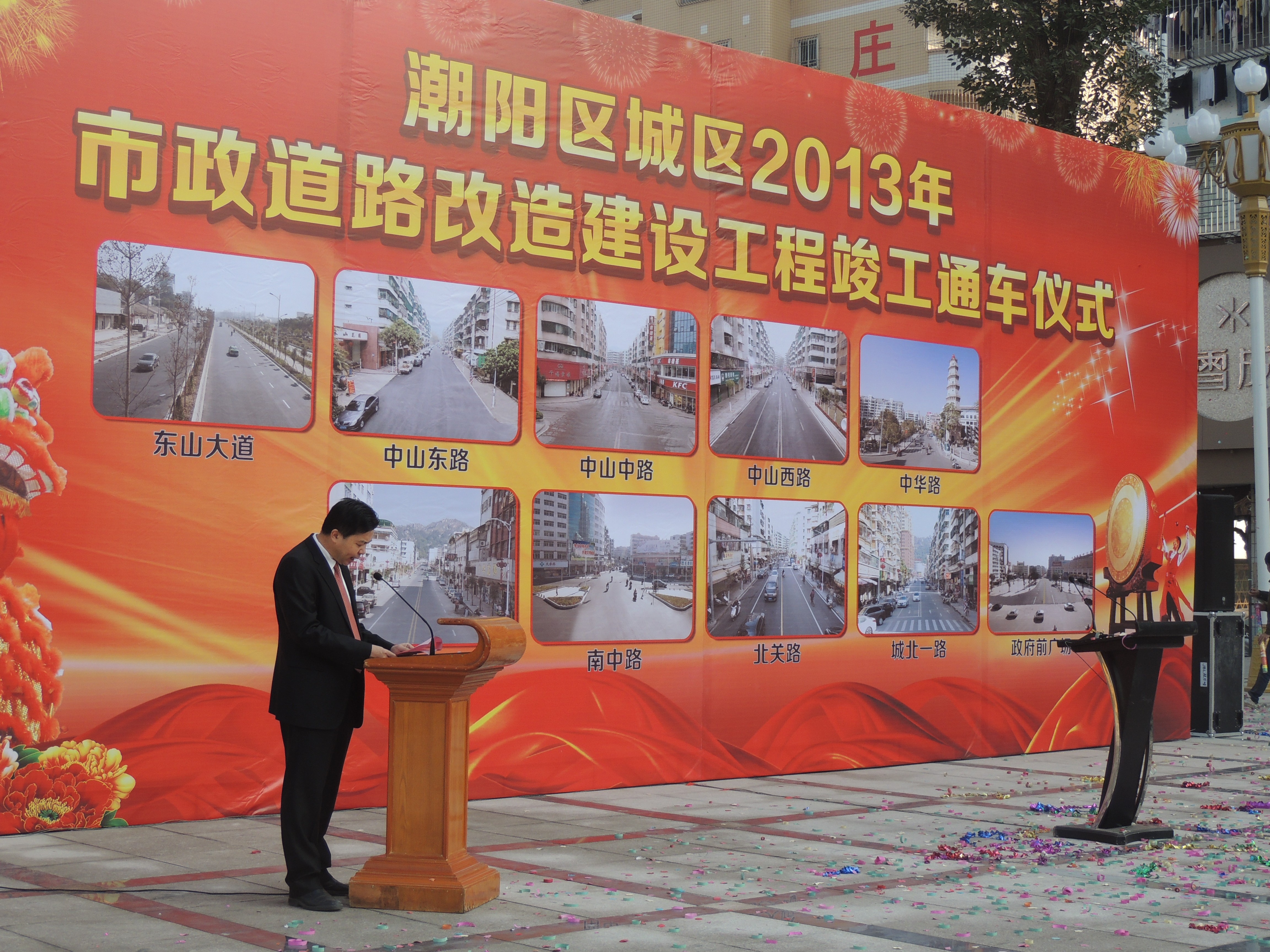 2014年1月29日举行竣工通车仪式的城区市政道路包括东山大道、中山东路、中山中路、中山西路、中华路、城北四路、南中路、北关路、城北一路、政府前广场,总里程:16.585公里,总投资:约4.5769亿元。这不仅大大缓解潮阳城区的交通压力,方便群众出行,更提升了潮阳城区品位和形象,促进经济社会协调发展。