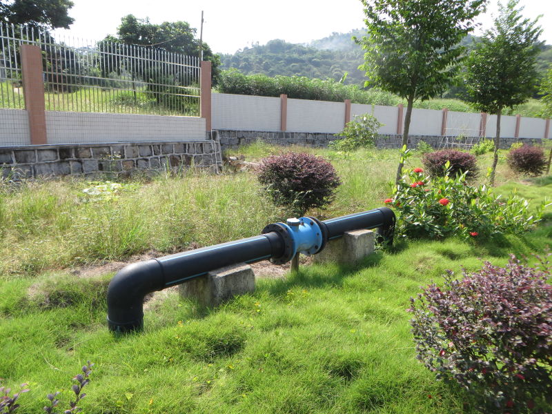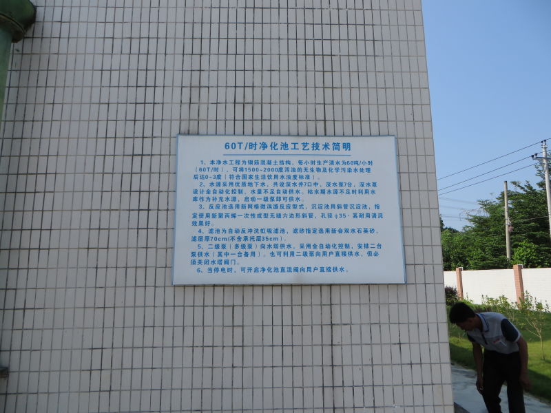 水厂设计供水能力600立方米/天,其中150t水塔一座(30米高)、净水池一座(60t/h),取水源采用地下优质深水,设计采用深水泵、过滤池、加药(消毒)间、送水泵房、输出管网(PE),净水构筑物均按现行供水标准建设。水厂净水工程为钢筋混凝土结构,每小时生产清水60立方米,可将1500至2000度浑浊的无生物及化学污染处理后达0至3度(符合国家生活饮用水浊度处理)。项目建成后,大力改善村居用水问题及水质量。