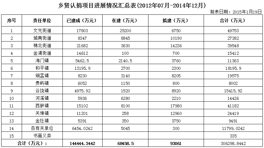 乡贤认捐项目进展情况汇总表(2012年7月-2014年12月)
