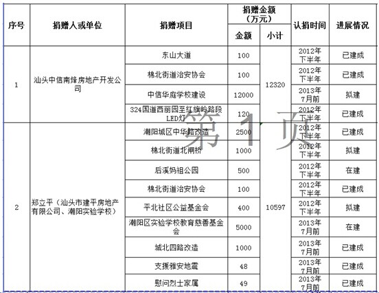金浦街道乡贤认捐项目进展情况表