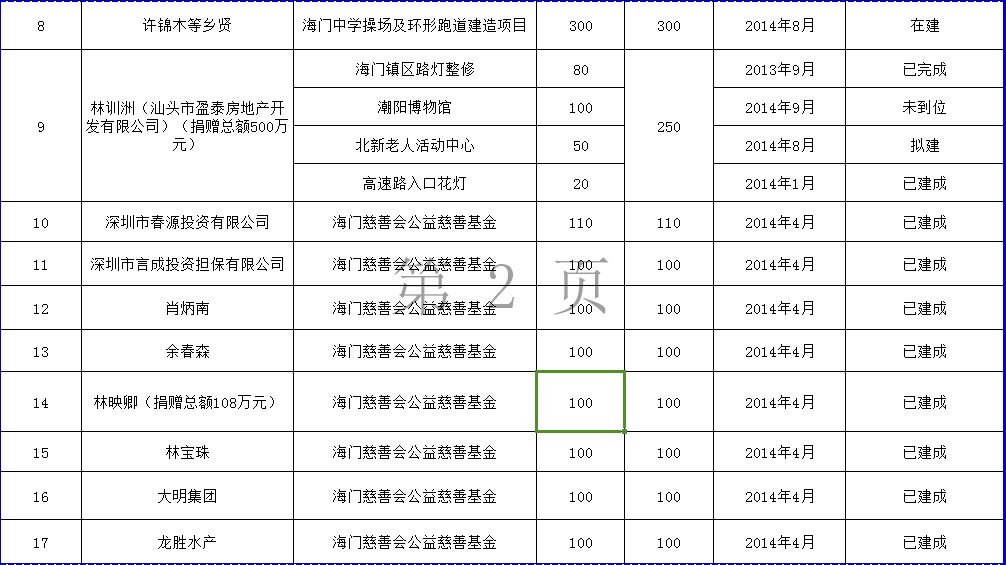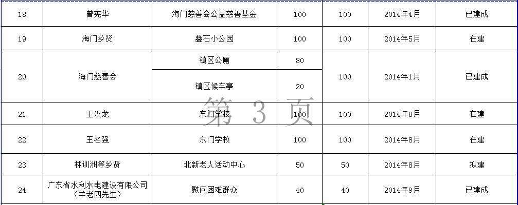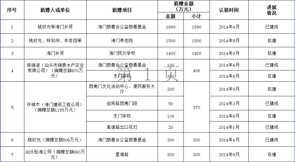 海门镇乡贤反哺家乡建设认捐项目进展情况表