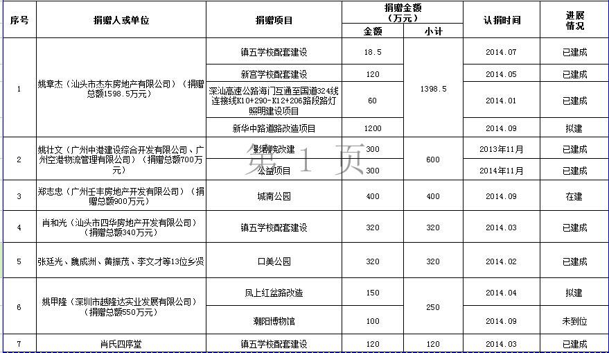 关埠镇乡贤反哺家乡建设认捐项目进展情况表