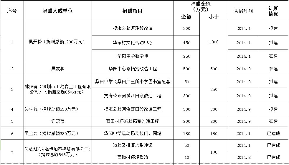 贵屿镇乡贤反哺家乡建设认捐项目进展情况表