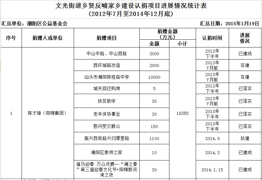 文光街道乡贤反哺家乡建设认捐项目进展情况汇总表