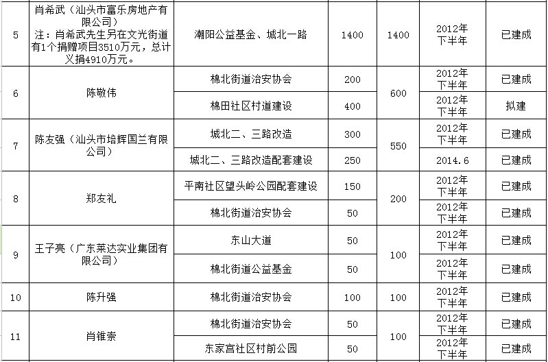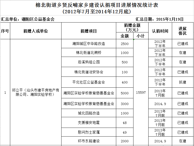 棉北街道乡贤反哺家乡建设认捐项目进展情况汇总表