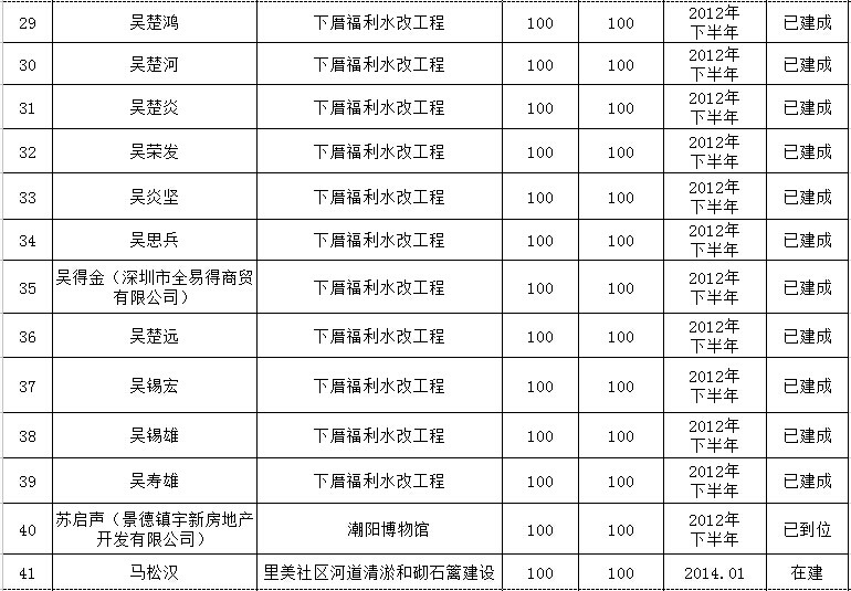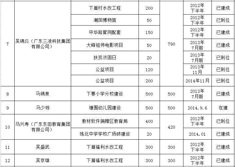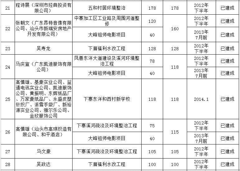 铜盂镇乡贤反哺家乡建设认捐项目进展情况汇总表
