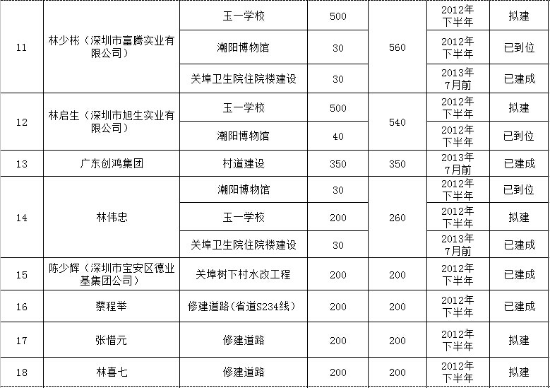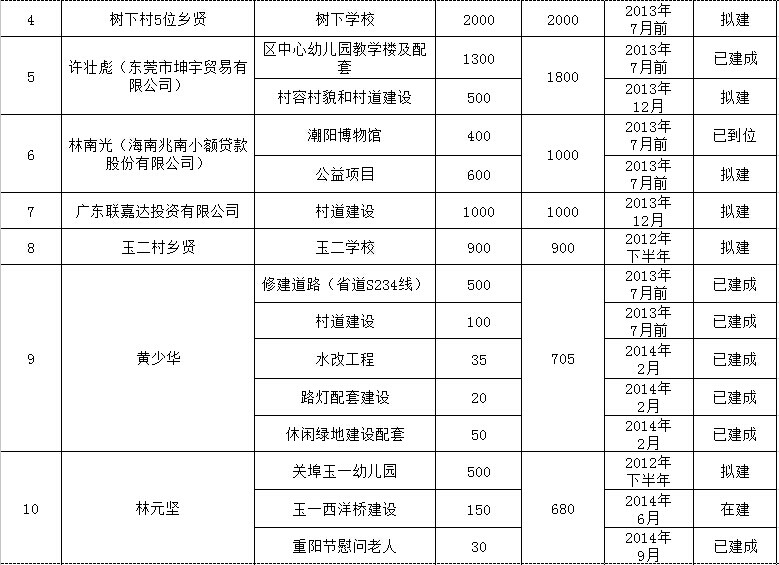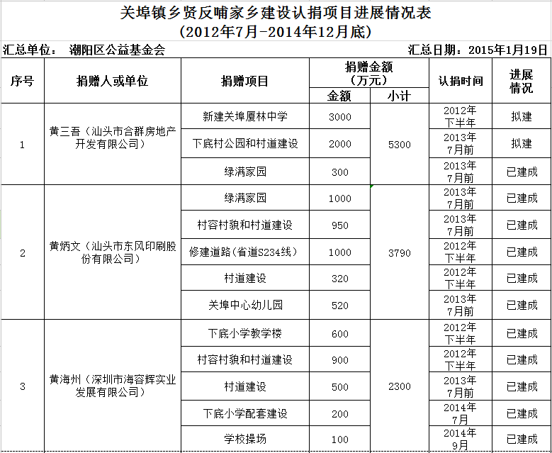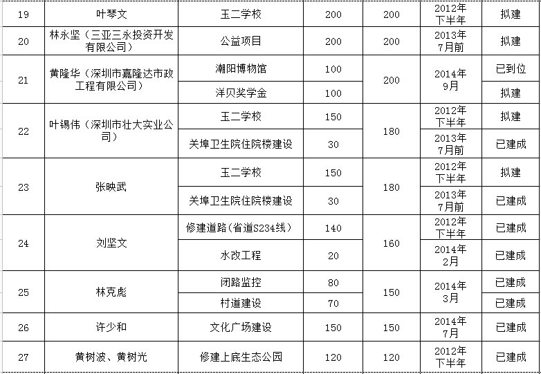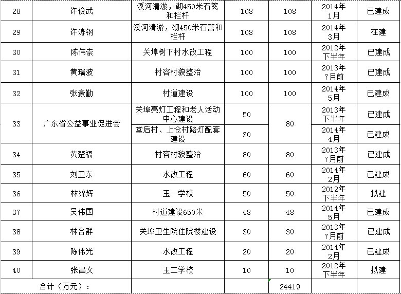 关埠镇乡贤反哺家乡建设认捐项目进展情况汇总表