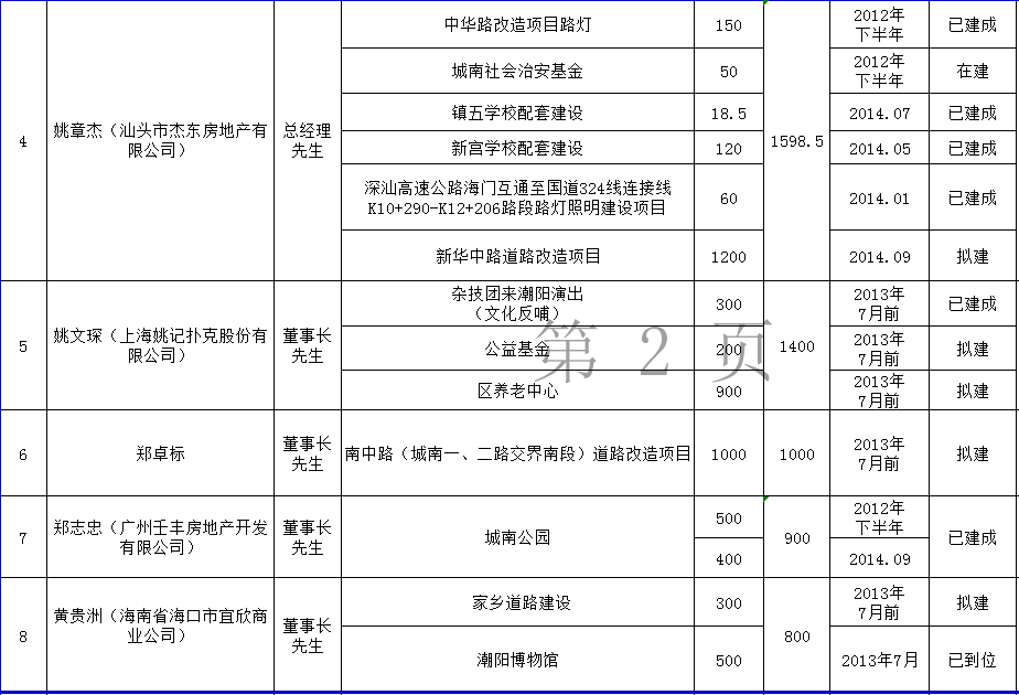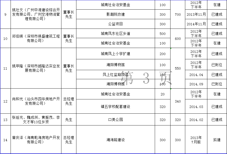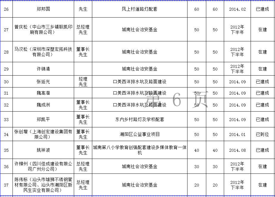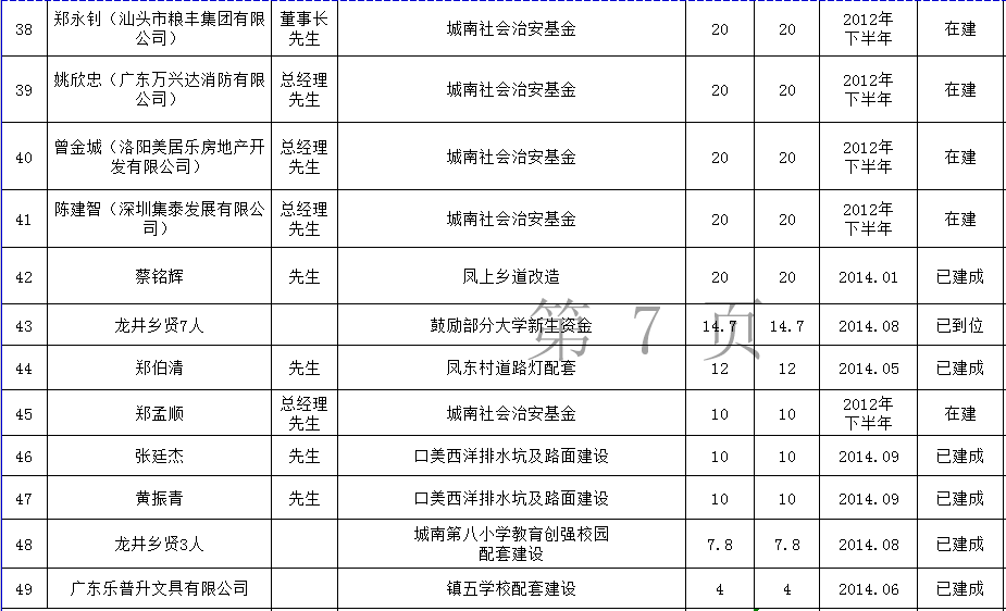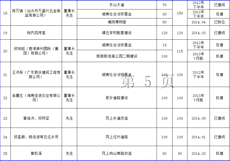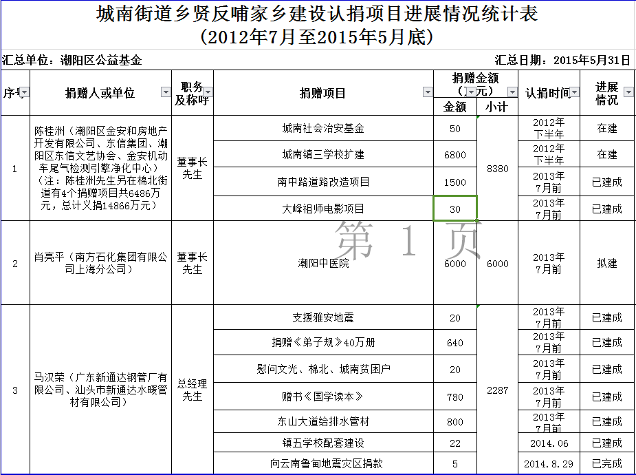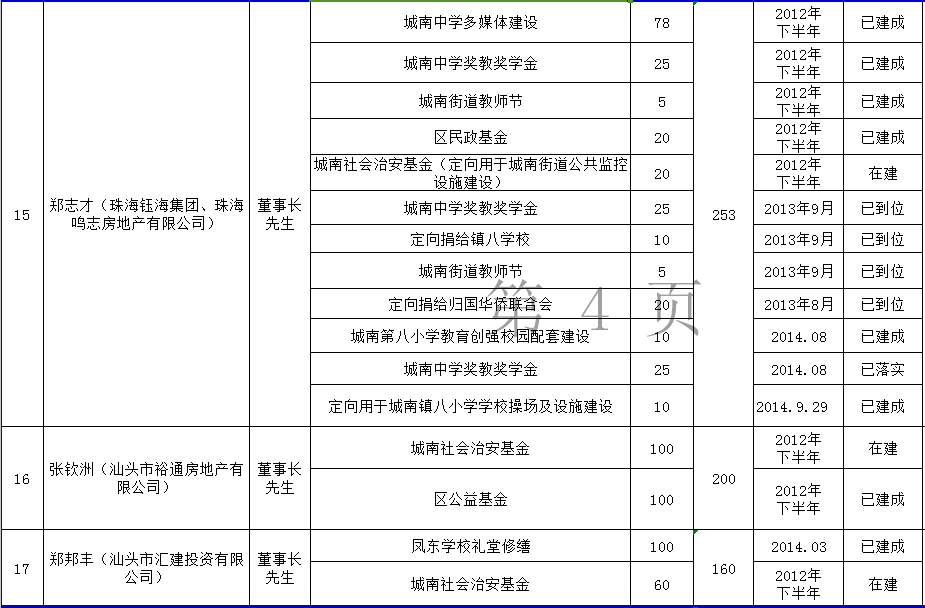 城南街道乡贤反哺家乡建设认捐项目进展情况统计表