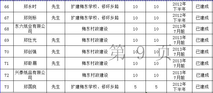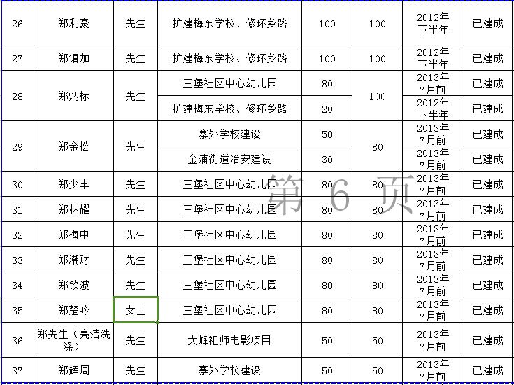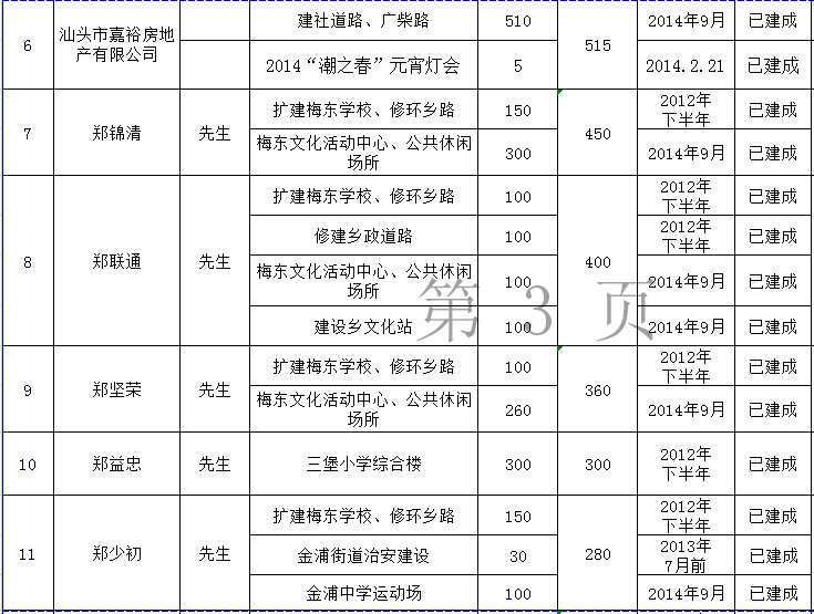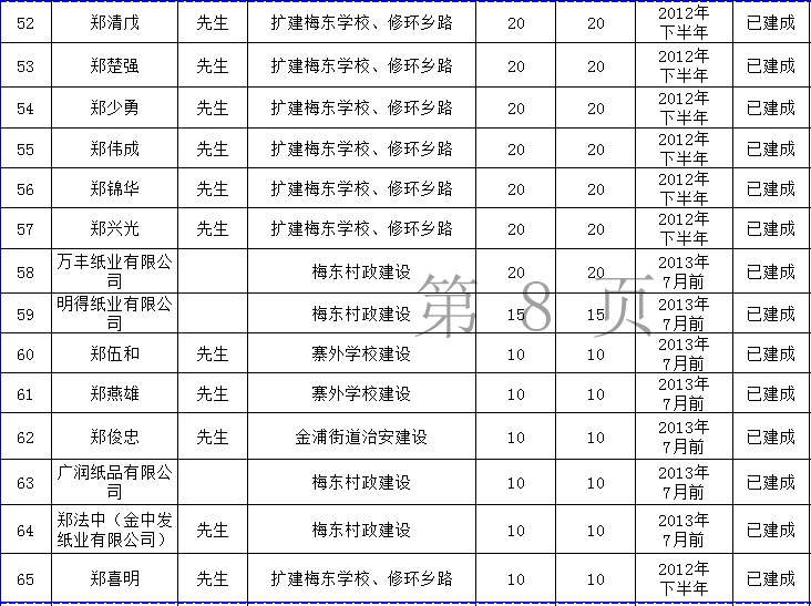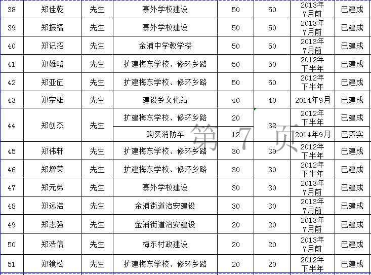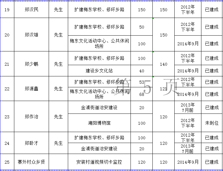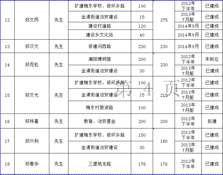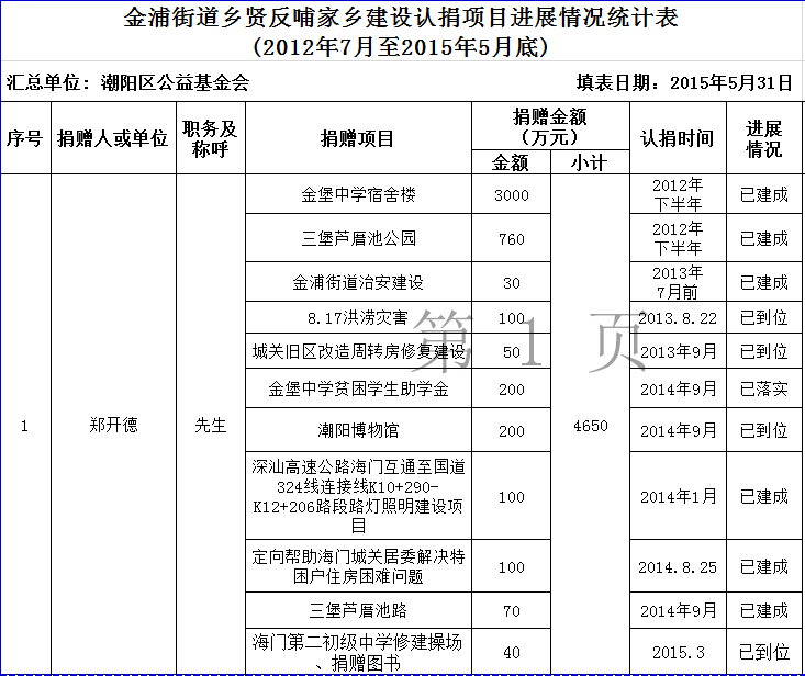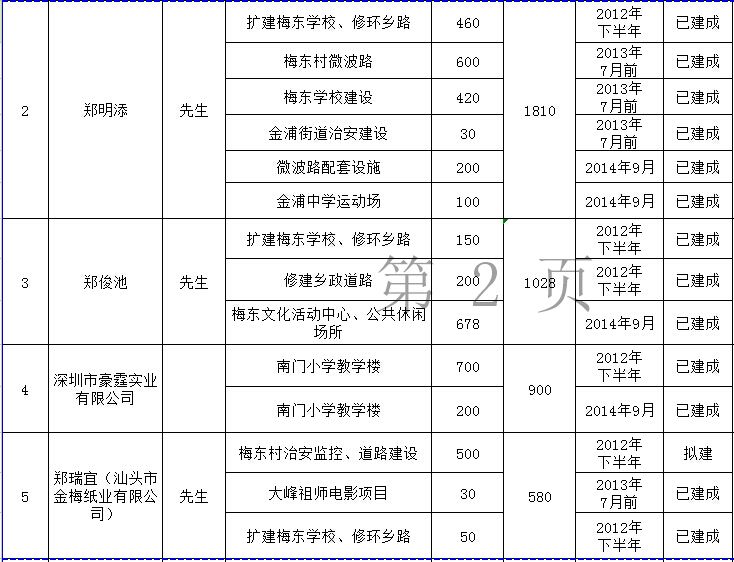 金浦街道乡贤反哺家乡建设认捐项目进展情况统计表