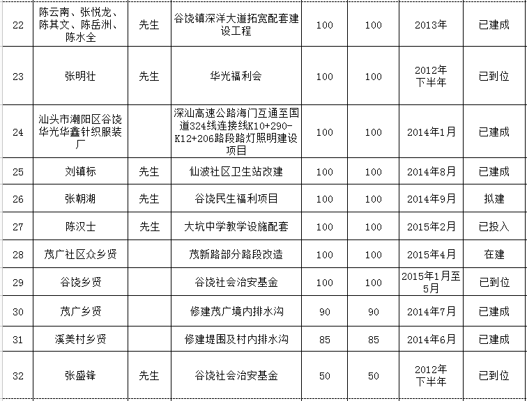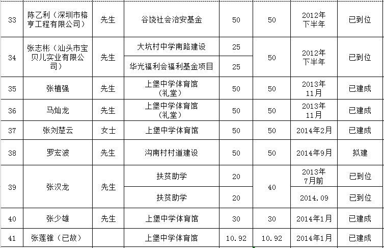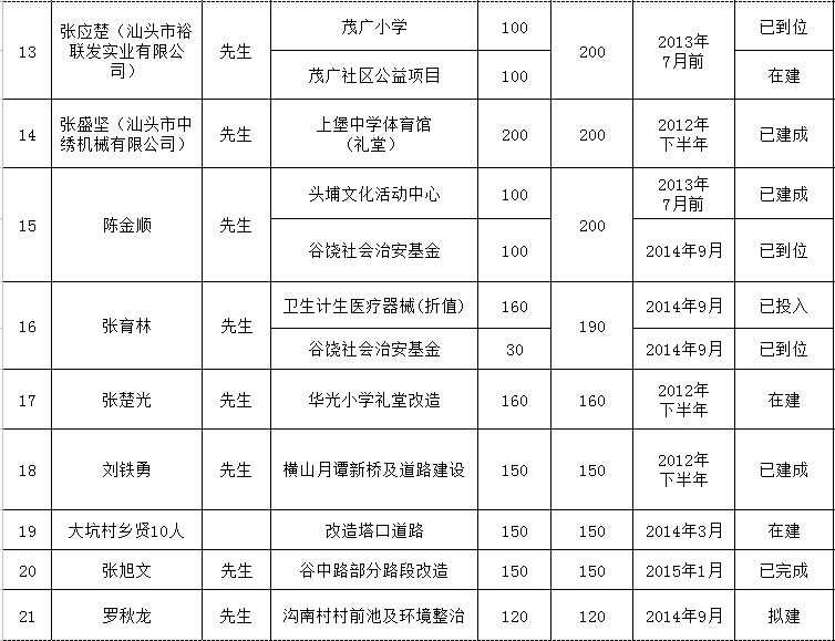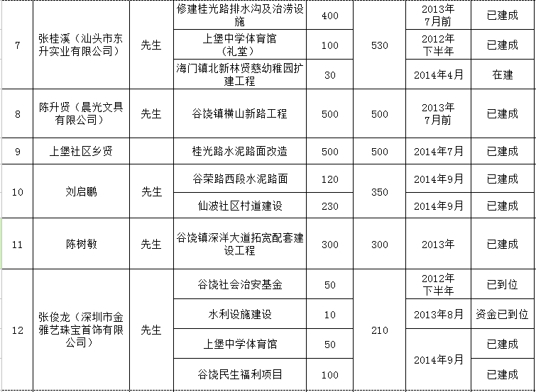 贵屿镇乡贤反哺家乡建设认捐项目进展情况统计表