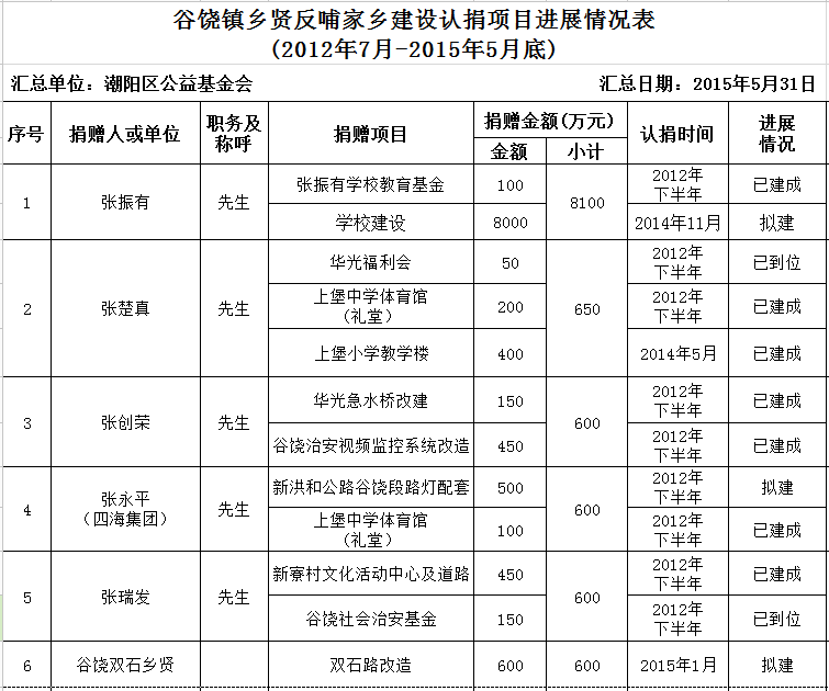 谷饶镇乡贤反哺家乡建设认捐项目进展情况统计表