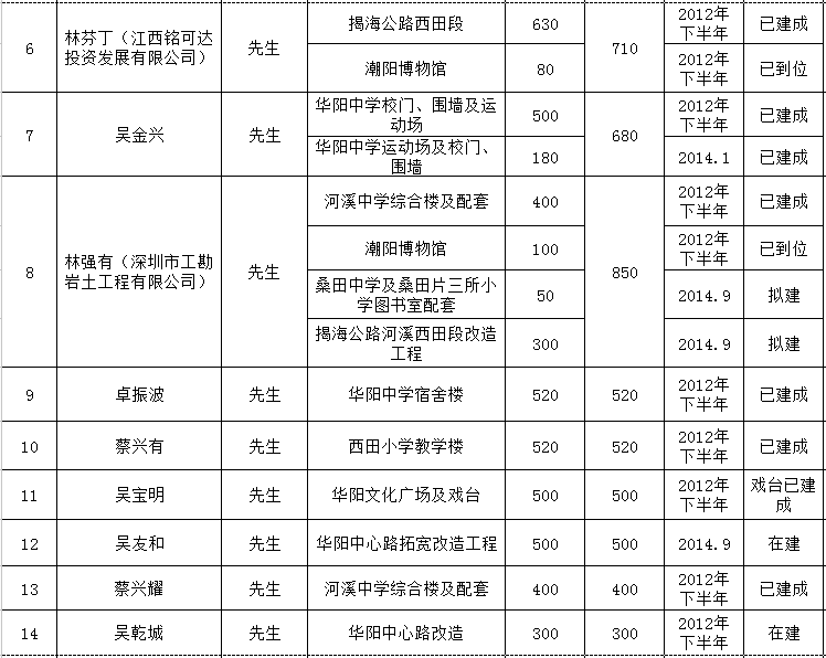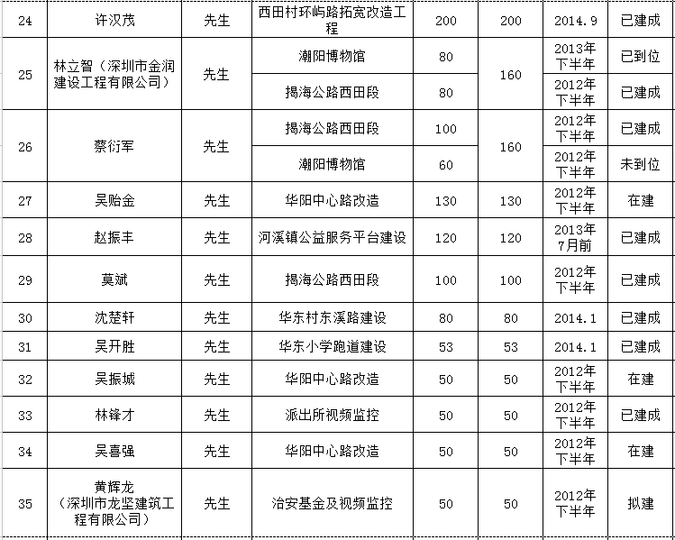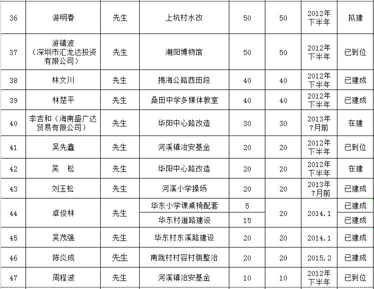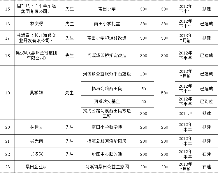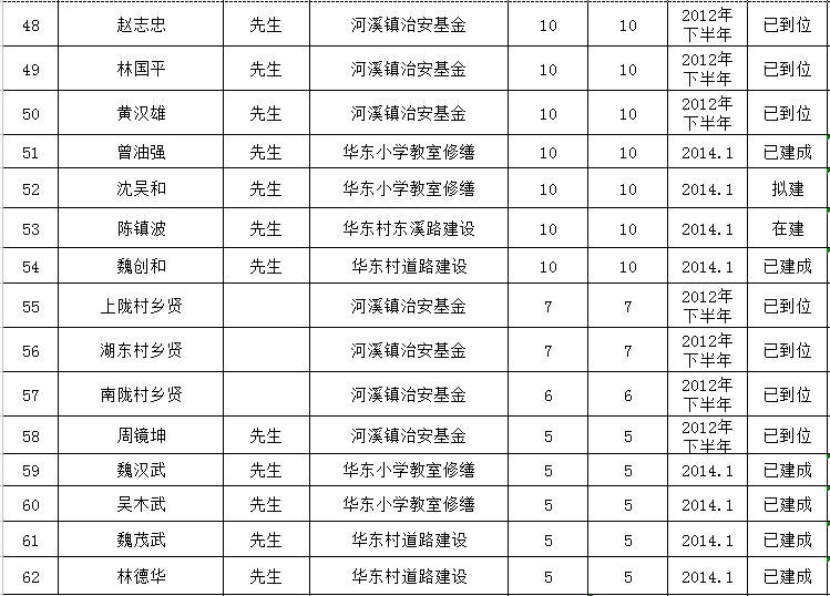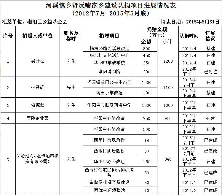 河溪镇乡贤反哺家乡建设认捐项目进展情况统计表