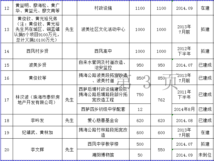河溪镇乡贤反哺家乡建设认捐项目进展情况统计表