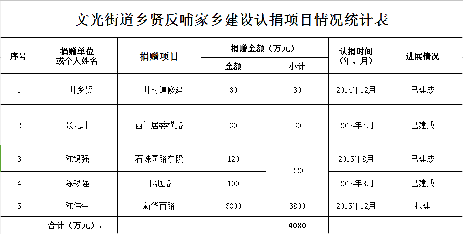 文光街道乡贤反哺家乡建设认捐项目情况统计表