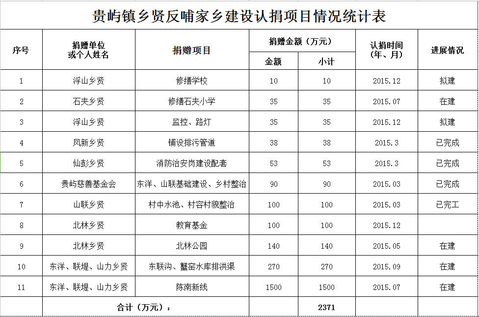 贵屿镇乡贤反哺家乡建设认捐项目情况统计表
