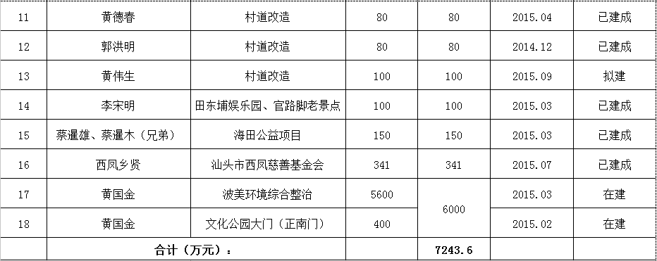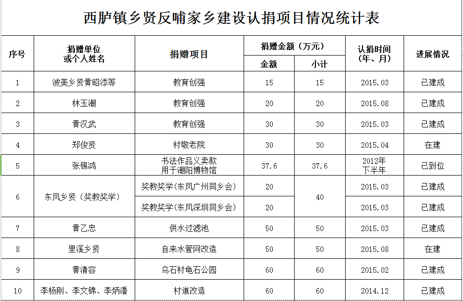 西胪镇乡贤反哺家乡建设认捐项目情况统计表