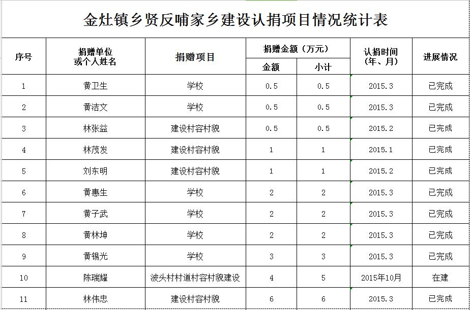 金灶镇乡贤反哺家乡建设认捐项目情况统计表