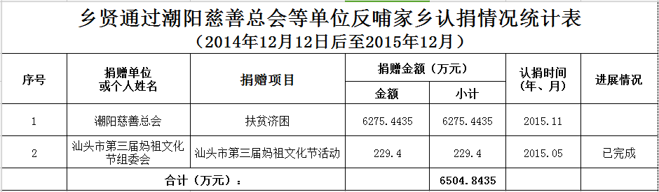 乡贤通过各单位乡贤反哺家乡建设认捐项目情况统计表