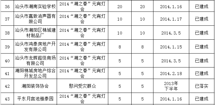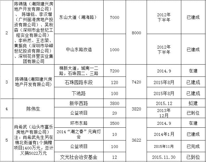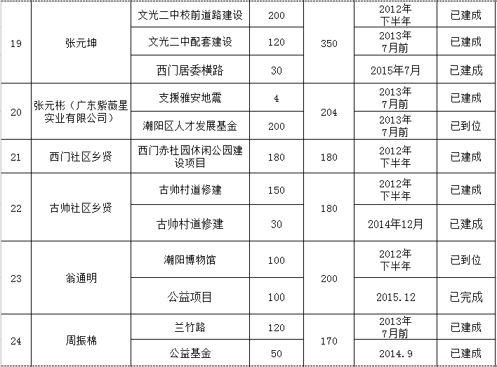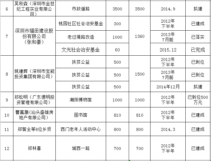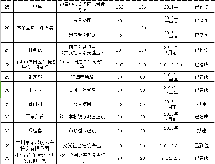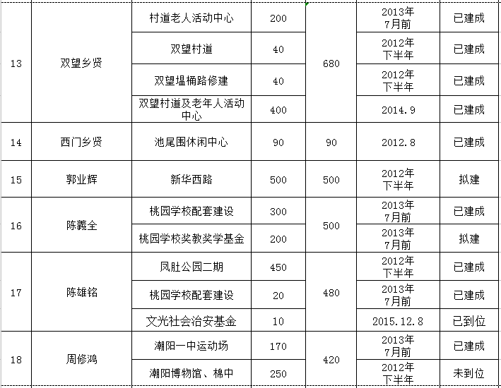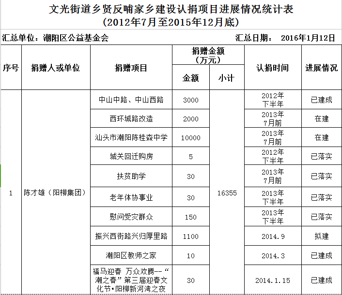 文光街道乡贤反哺家乡建设认捐项目进展情况统计表 (2012年7月至2015年12月底)