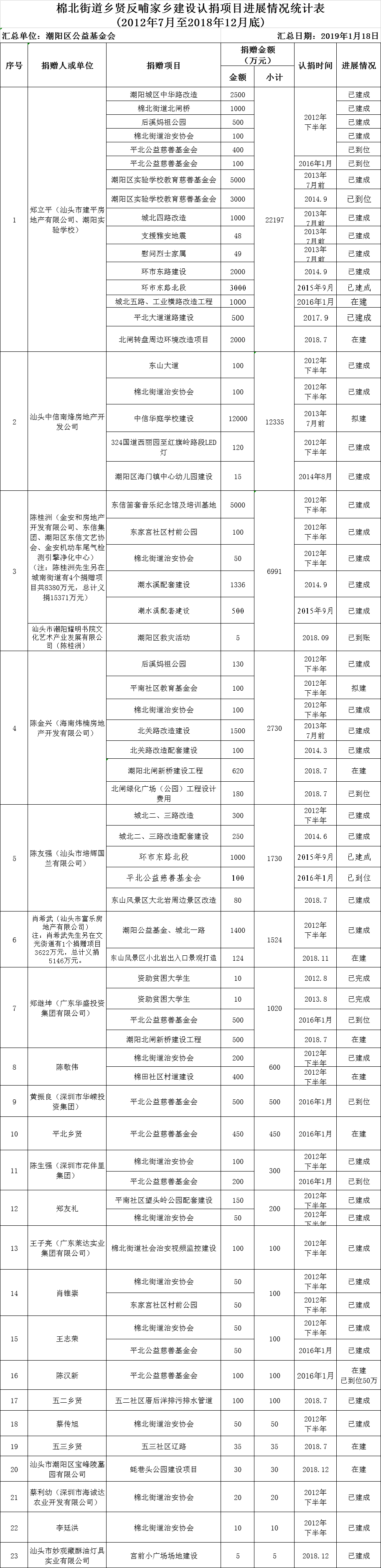 棉北街道乡贤反哺家乡建设认捐项目进展情况统计表